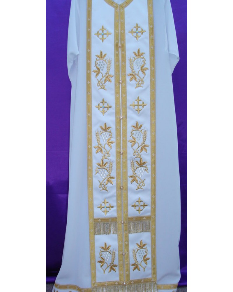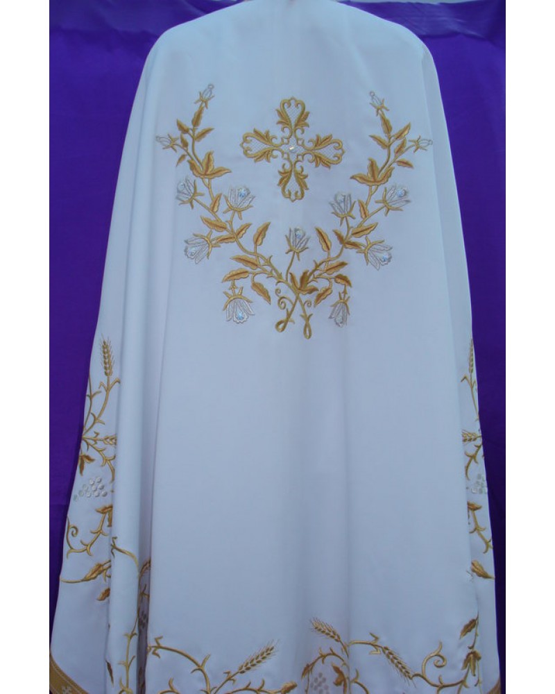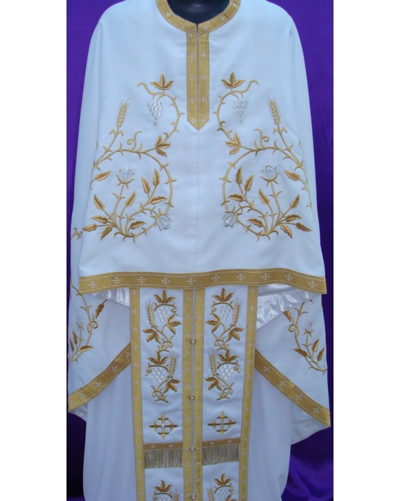 Vesmantul este brodat cu fir metalic ,cu stihar de marochen. La comanda se poate realiza pe mai multe culori.